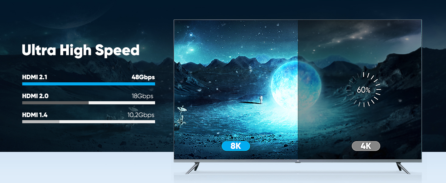 HDMI 2.1 cable provides 48Gbps bandwidth to support 8K at 60Hz and 4K at 120Hz. Compared to HDMI 2.0, it enables advanced features like eARC, Dynamic HDR, VRR and ALLM for high-end gaming and home theater setups.