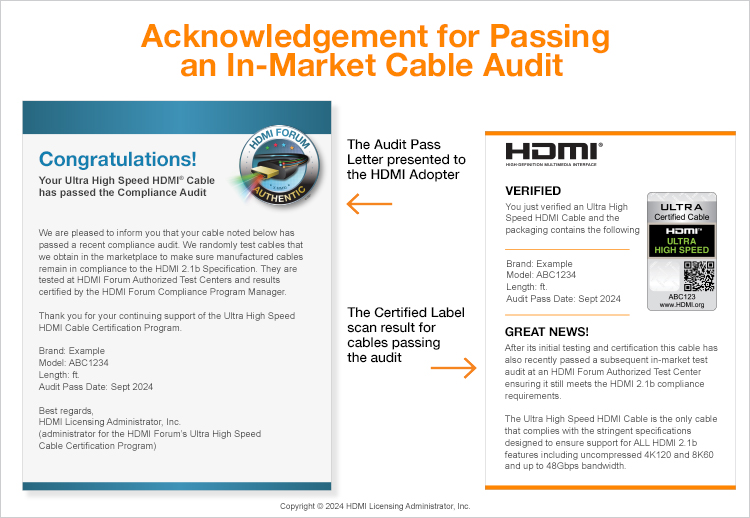 All certified cables of any length must pass certification testing at an HDMI Forum Authorized Testing Center (Forum ATC). Once certified, cables will be required to affix an Ultra High Speed HDMI Certification Label to each package or unit of sale enabling consumers to verify the certification status of the product.