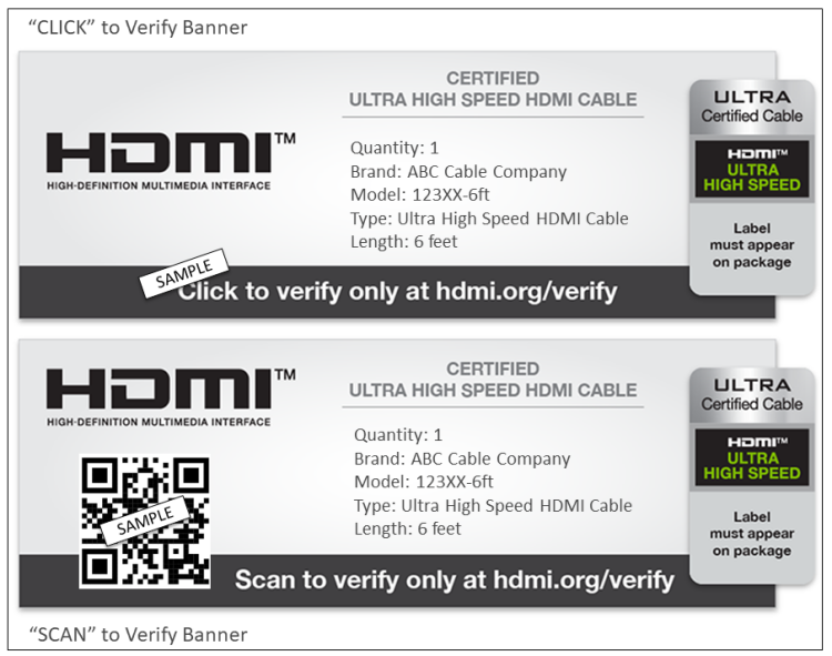 The Verification Banners are an optional add-on to the existing HDMI Cable Certification Program. The website banners enable consumers to verify the certification status of cables while shopping on manufacturer and reseller websites. The Verification Banners can be either clicked or scanned, displaying the brand name, model number and length - the same as when scanning the physical Certification Labels affixed to the cable packaging.