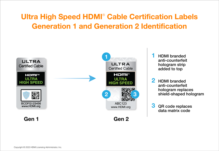 The HDMI Cable Certification Program supporting Ultra High Speed HDMI Cables is changing to a new generation (Gen 2) label. The original Gen 1 labels in the market will continue to be supported with the proprietary scanning app for the immediate future. Please note that consumers will be seeing two versions of the labels and they use different scanning apps. Please download the informational brochure for complete details here